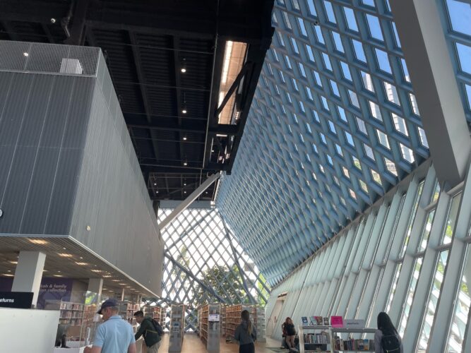 On Saturday, we passed the Space Needle while taking a bus to Pier 50, then from the docks walked to Pike Place, where we ate a delicious meal of steak and eggs and chicken caesar salad in a quaint little cafe, the interior of which was adorned with plants and string lights. We also stopped by the Seattle Public Library, which put every library in North Carolina to shame.
